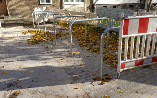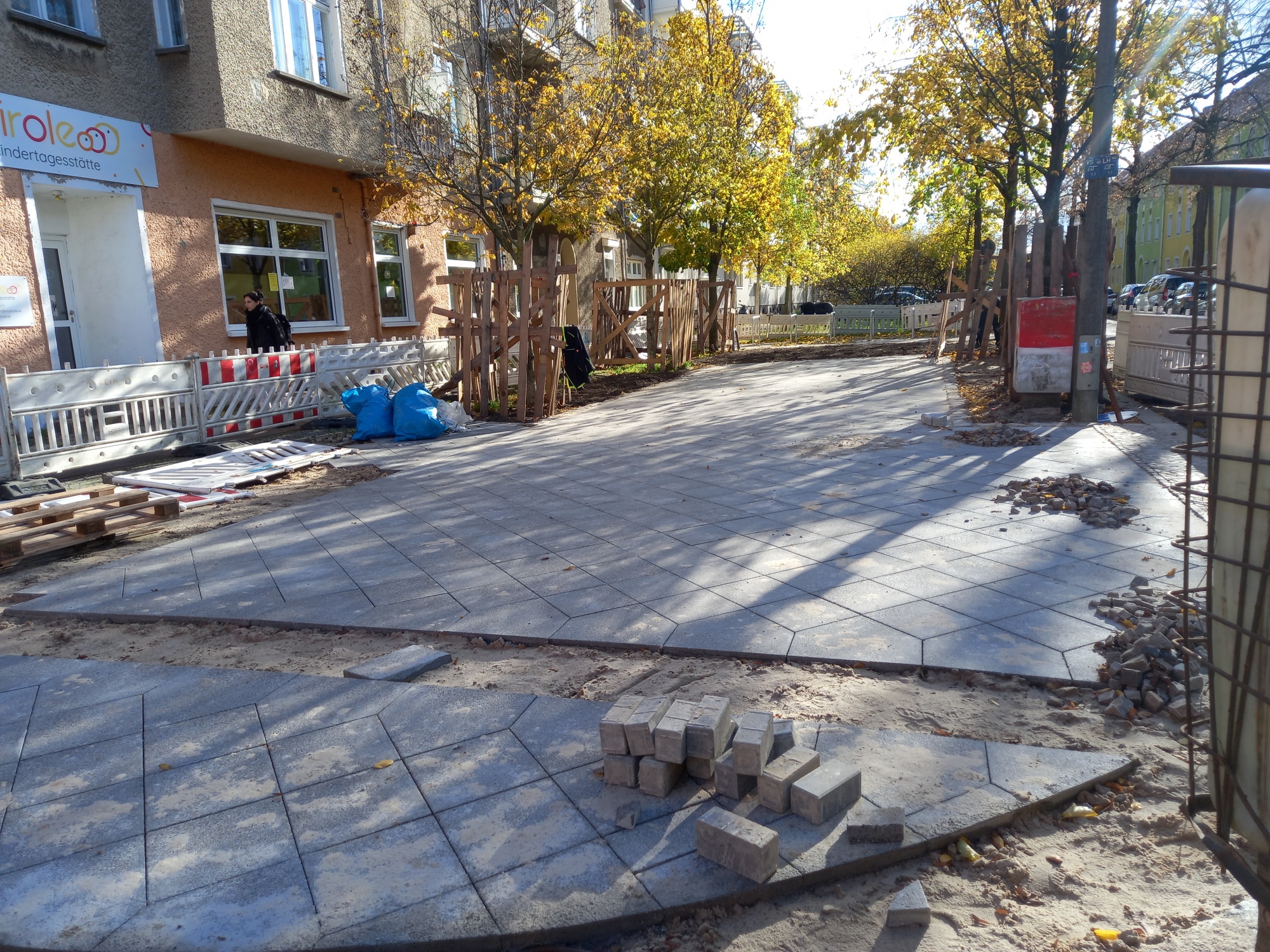 Darüber hinaus wurde die früher ungenutzte, vollflächig gepflasterte Fläche vor der Kita im Bereich der Bäume entsiegelt. Damit haben die Bäume mehr Platz im Wurzelbereich erhalten. Die neuen Versickerungsflächen haben eine positive Wirkung auf das Mikroklima. Hier ergibt sich in Zukunft ggf. auch die Möglichkeit der Bepflanzung, z.B. durch Baumscheibenpatenschaften. Durch die erflogreiche Umsetzung der Maßnahe ist außerdem die Aufenthaltsqualität durch die zwei neu aufgestellten Bänke erhöht worden, welche zum Verweilen für die Nachbarschaft und Kitaeltern einladen. Zuletzt wurde noch ein weiterer Baum gepflanzt und Fahrradbügel aufgestellt.